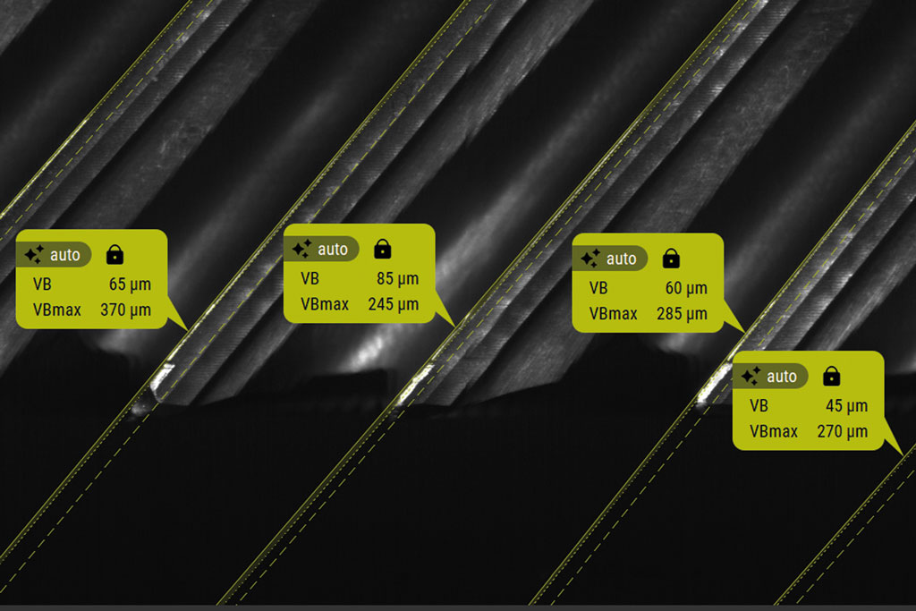In combination with the new Visual Tool Check 1.6 software, the VT 122 camera makes AI‑supported wear measurement possible, which automates previously manual processes. This rapid process documentation is integrated into the machining operations, and is thus a key benefit for industries such as aerospace and medical tech. The VTC cycles make it very easy for the operator to direct the AI-supported wear-measurement process. The NC control slowly rotates the tool directly in front of the camera. The result is a panoramic image of the tool that includes all of its flutes. The Visual Tool Check 1.6 software then automatically determines the flank wear.